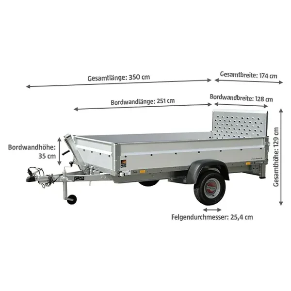 Nutzlast: 1.053 kg, Einachser, Kasteninnenmaß: 251 x 128 x 34,5 cm, Gebremst